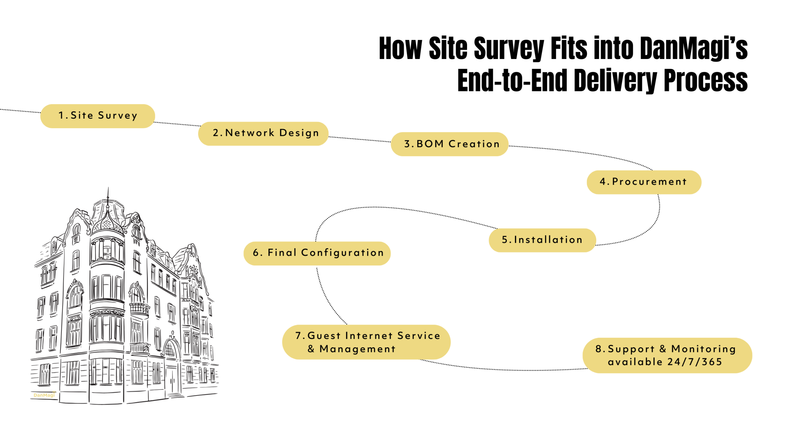 Site Survey The Foundation of a Perfectly Engineered Hotel Network Delivering exceptional connectivity starts with understanding your property’s unique environment.Every hotel has different construction materials, architectural layouts, RF behavior, guest density patterns, and IT requirements.A Site Survey is the critical first step that allows DanMagi to design a network that is reliable, cost-effective, and future-proof. Why a Professional Site Survey Matters Hotel Networks face greater complexity than ever:High guest device densityStreaming & Casting expectationsThick walls, varied materials, historic buildingsInterference from conference equipment & IoTMultiple guest and staff SSIDsPAN and GHOST technologiesBandwidth-intensive applicationsA generic installation simply cannot deliver the consistency or performance that modern hospitality demands.DanMagi’s Site Survey ensures your network is engineered properly, professionally, and with long-term operational stability in mind. What DanMagi's Site Survey Includes Our Site Survey is conducted by a specialized DanMagi engineer, either onsite or through hybrid analysis depending on your property needs. ✔️ Full Physical Assessment A complete walkthrough of the property to analyze:Building materialsRoom layoutsCoverage gapsInterference sourcesAccess point placementCabling routes & Equipment roomsOutdoor vs. Indoor requirements ✔️ Radio Frequency (RF) Mapping We measure:Signal strength & noiseChannel OverlapDead zonesHigh-density guest zones (lobbies, F&B, meeting rooms, pools)This ensures accurate planning for seamless coverage. ✔️ Evaluation of Existing Infrastructure We assess your:Switches, APs, controllersCabling quality & capacityPower availabilityIDF / MDF conditionsExisting Wi-Fi design (if any) ✔️ Compliance & Brand Requirements We align with your brand’s IT standards for:Wi-FiSecurityPMS connectivityGuest recognitionCasting / PAN / GHOSTBandwidth per user ✔️ Future-Proofing Requirements We assess what the hotel will need not only today, but in the coming years, based on:Guest Behavioral trendsIncreasing device countsStreaming demandsHD / 4K castingCloud applicationsIoT growth Detailed Engineering Report After completing the survey, DanMagi provides a detailed engineering report, which includes: ☑️ Network Heatmaps &Coverage Models Visual renderings of:Expected coverageAP placementsSignal qualityInterference zones ☑️ Infrastructure Assessment Summary Clear documentation of what is functional, what requires upgrades, and where network bottlenecks exist. ☑️ Recommended Network Design A customized design tailored to your property, including:AP count & placementSwitching architectureVLAN segmentationPAN / GHOST casting support designSecurity best practices ☑️ Bill of Materials (BOM) A complete list of recommended hardware:QuantitiesSpecificationsCosts ☑️ Commercially Efficient Recommendations DanMagi always prioritizes:Cost-effective solutionsEliminating unnecessary equipmentMaximizing performance of existing hardware where possible. Benefits for the Hotel ✔️ Optimum Wi-Fi and PAN/GHOST Performance Correct placement and configuration result in:Stronger signalHigher speedsStable castingImproved guest satisfaction ✔️ Lower Long-Term Costs Proper design means fewer:Support callsHardware replacementsEmergency fixesGuest complaints ✔️ Faster Deployment A clear, accurate plan removes uncertainty and speeds up installation. ✔️ Consistency Across All Properties For hotel groups, Site Surveys ensure all properties meet brand standards and operate on a unified architecture. Why DanMagi is the Best Partner for Professional Wi-Fi Site Surveys ☑️ Deep Hospitality Expertise Our engineers understand hotel environments in ways typical IT vendors do not. ☑️ Global Footprint Teams across EMEA, AMERICAS, APAC ensure coverage for all regions. ☑️ Cloud & Guest-Centric Design Every designed is optimized for:HSIA performanceGuest RecognitionGHOST PAN / castingBrand consistencyReliability at scale ☑️ Vendor-Agnostic We work with all major networking brands and can integrate with any current infrastructure. ☑️ Trusted by Top Hotel Brands Worldwide DanMagi operates across 40+ countries, collaborating with major luxury brands. Ready to Start Your Project the Right Way? A professional Site Survey is the foundation of every high-performing hotel network.